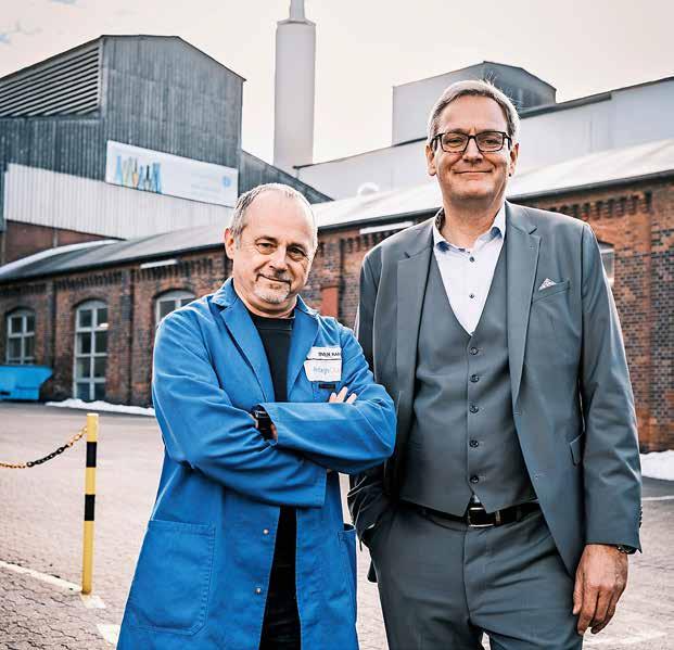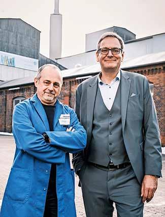 „Wasserstoff wird hier eine Rolle spielen“, sagt Sven-Roger Kahl (li.), Ingenieur für Glastechnologie von Ardagh Glass Packaging. Der Nienburger Werksleiter Andreas Falk setzt auf den Anschluss ans Wasserstoffkernnetz.