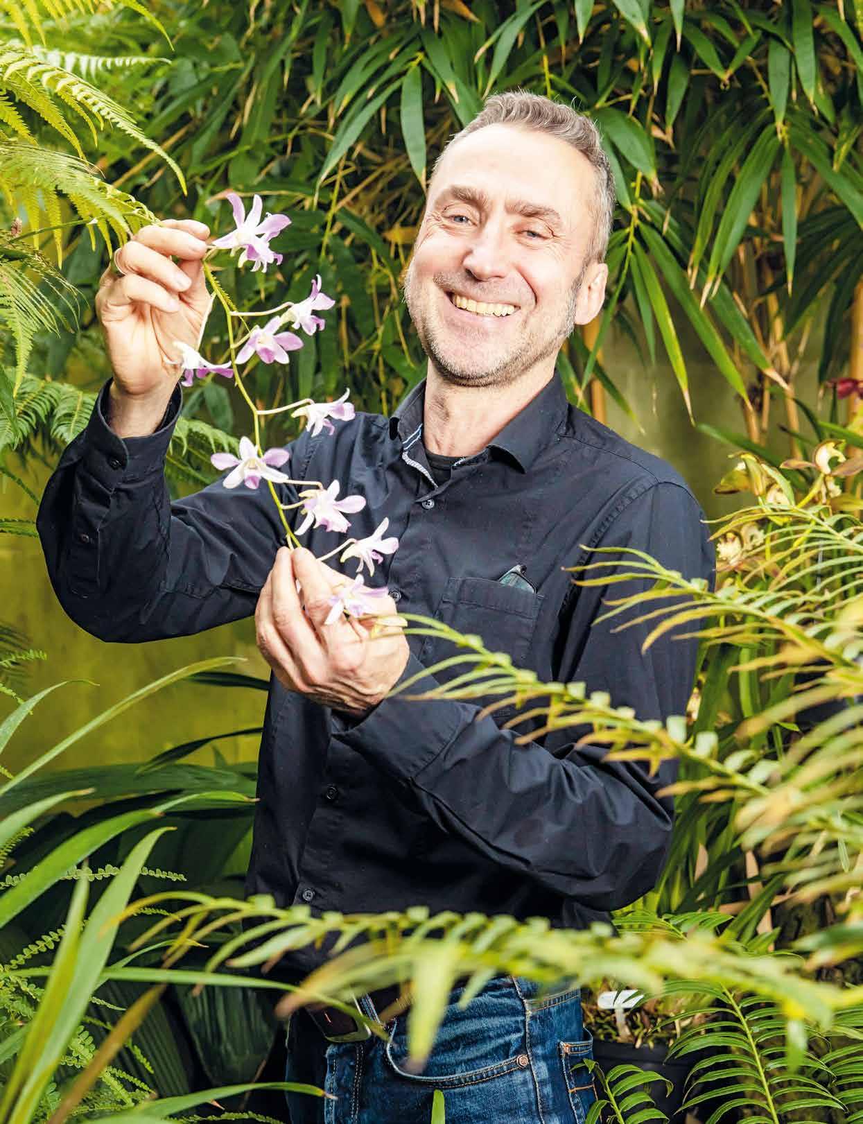 Die Orchideen stehen in Töpfen auf dem Boden, aber hängen auch buch stäblich in der feuchtwarmen Luft. Das mögen sie nämlich besonders gerne. Die meisten Orchideen sind Luftwurz ler. Sie beziehen Wasser zum Leben aus der Luft. Staunässe in einem Topf mögen sie hingegen gar nicht. „Dann faulen unter Umständen ihre Wurzeln ab“, erklärt Boris Schlumpberger. Er ist Kustos der Herrenhäuser Gärten und beschäftigt sich als Biologe schon sehr lange mit den Pflanzen, die als sensible Schönheiten verschrien sind. Doch sie sind robuster als gedacht.