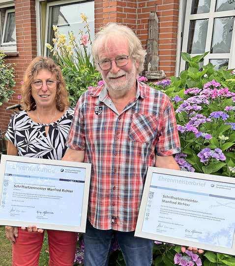 BegehrterMeistertitelinBiberachangepeilt ImAltervon15JahrenverlässtererstmalsdieInsel,zieht für die Ausbildung nach Oldenburg und lernt in derTraditionsdruckereiIsensee,wasesheißt,imgrafischenSystemzudenken:„NichtinZentimetern,sonderninPunkt wirdgerechnet.DerSetzkastenfolgtnichtdemAlphabet, sondernderHäufigkeitdesVorkommenseinesjedenBuchstabens.Dasmusstesitzen,damitmanzügigvorankam“, erinnertersich.ImSommer1972lernterschließlichseine spätere Frau Petra kennen. Gemeinsam zieht das Paar nachwenigenMonatenaufdieInselzurück,daManfred RichterimelterlichenBetriebdringendgebrauchtwird. Daskommtihmnichtungelegen,dennermöchteden MeistertitelamrenommiertenHauchler-StudioinBiberachanderRißerwerben.„DadieSchulesehrgefragtwar, musste ich anderthalb Jahre auf einen Platz warten“, so Richter. Eine Zeit, die er im väterlichen Betrieb sinnvoll überbrückt. 1975 legt er als jüngster Absolvent nach elf MonatenVollzeit-Unterricht seine Meisterprüfung ab.