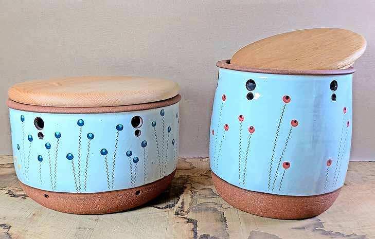 Seit gut einem Jahr fertigt Frauke Farin aus Oldenburg ihre Brottopf-Reihe. „Ich hatte echt Respekt davor, mit dieser MasseTon zu arbeiten“, erzählt die Keramikerin.FüreinenTopfverarbeitetsieungefährfünfKilodavon.FürsolcheMengen Ton sei dieVorbereitung entscheidend: Er wird durchgeschlagen, mitTonfarbe undFarbpigmentenüberzogenundmitMusternverziert.FürdieWirkungseider richtigeTrockenheitsgradwichtig.DieDeckelfürdieUnikatedrechseltihrNachbar. „Besonders gefällt mir die Kombination vonTon und Holz“, sagt Farin.(JTE)