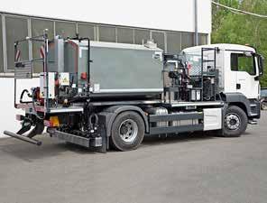 WEIRO® Anspritzmaschine HK 1000 PH auf LKW-Fahrgestell mit 3000 l Nutzinhalt und hydraulischem Spritzbalken, max. Arbeitsbreite 3,60 m, zur Herstellung des Schichtenverbunds, zusätzlich Rührwerkskocher mit 500 kg Nutzinhalt für die Versiegelung von hohem Rand und Arbeitsnaht, Dieseltankstelle mit 1000 l Nenninhalt für die Betankung anderer Baumaschinen sowie Wassertank (3.000 l). Das „Schweizer Taschenmesser“ für die Baustelle.