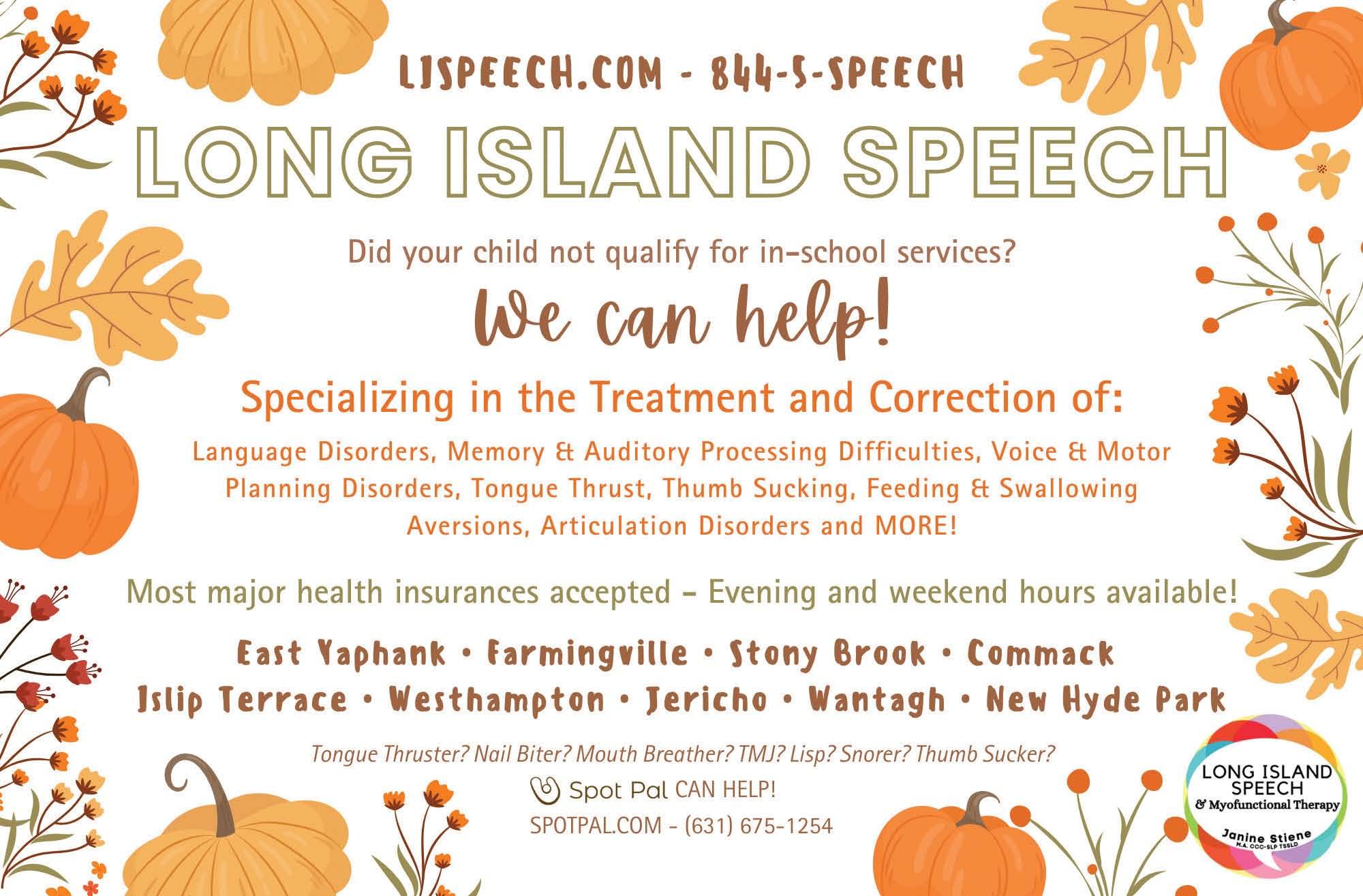Long Island Speech is the leading speech therapy provider on Long Island with 9 locations in Nassau and Suffolk County. They specialize in Myofunctional Therapy, PROMPT, Voice Disorders, Fluency, Augmentative Communications, Articulation, Feeding Therapy, Auditory Processing, Expressive/Receptive Language Disorders and so much more. Long Island Speech participates with most major health insurance companies and offers evening and weekend hours.