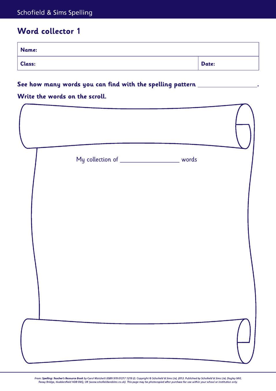 Word collector sheets encourage pupils to investigate different spelling patterns.