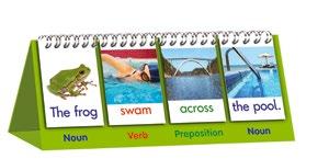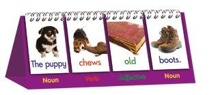 A double-sided flip stand that helps students build sentences with colour-coded nouns, adjectives, verbs, and punctuation. One side features words with blends, while the other side contains words with various vowel patterns, supported by picture examples. Measures 24 x 14cm.