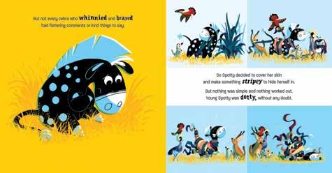 Spotty the zebra is tired of standing out in a crowd. Sick of being teased, Spotty asks a porcupine to paint her spots into stripes. Finally, she feels the same as everyone else ... but finds that conformity doesn’t bring the happiness she seeks. In the desert, she meets a wise golden mole, who tells her, “You’ll only be happy when you accept you.”