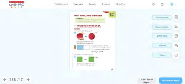 The Teaching Hub on Math Pro functions as a teacher resource for front-of-class facilitation during lessons. Controlled display of answers in the Coursebook and Practice Book assists teachers in carrying out formative assessment during lessons.