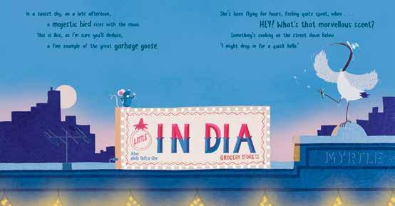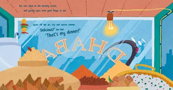 Bin Chicken’s been flying, feeling quite spent, when ... ‘HEY! What’s that marvellous scent?’ Spices fill the air, rice and curries simmer. ‘Delicious,’ she says. ‘That’s my dinner!’ It’s Diwali, and Ibis has crash-landed in a colourful and bright festival of lights ... now is her time to shine!