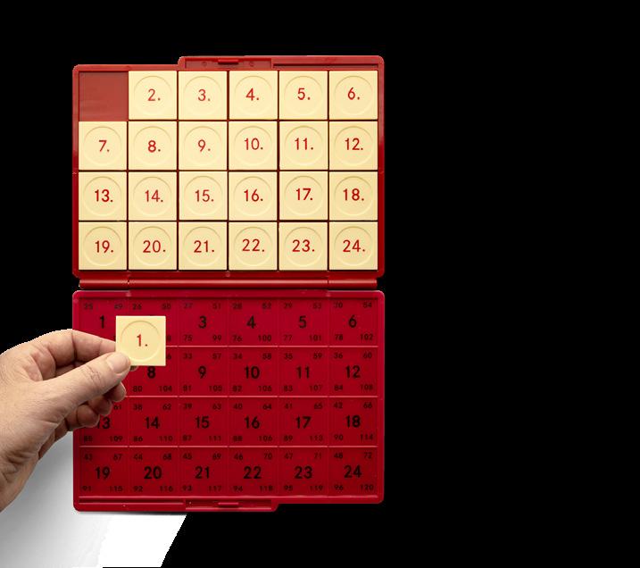 Neem het blokje met het rode getal 1 en begin met de eerste opgave. Wat is het antwoord en welk getal hoort daarbij? Leg blokje 1 op dat vakje onderin de basisdoos. Het blokje met het rode getal 1 moet naar boven liggen. Doe dit met alle 24 blokjes.