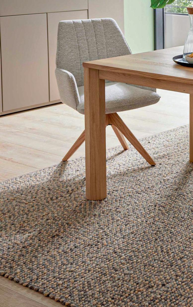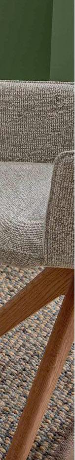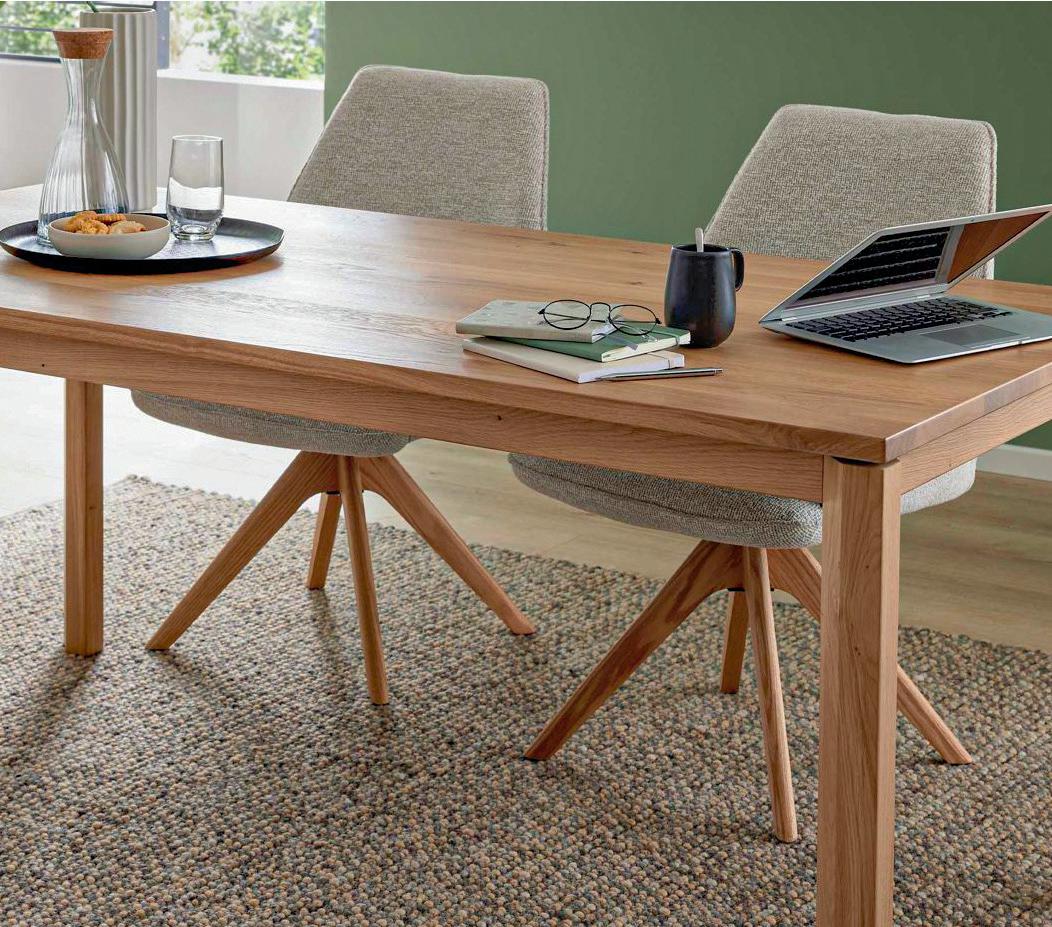 6 Ausziehtisch «Belgrad» Massiv-Eiche bianco, geölt, diagonaler Fuss, schräg stehend mit Zargenblende, Front-Slide-Auszug, 1 Falteinlage 100 cm, B ×T: 180 / 280 × 90 cm. 19564.11. Armlehnstuhl «Belgrad» Stoffbezug Flachgewebe Lodge line, Stativgestell Soft-Eiche bianco, B ×T× H: 48 × 90 × 90 cm. 19564.12.1