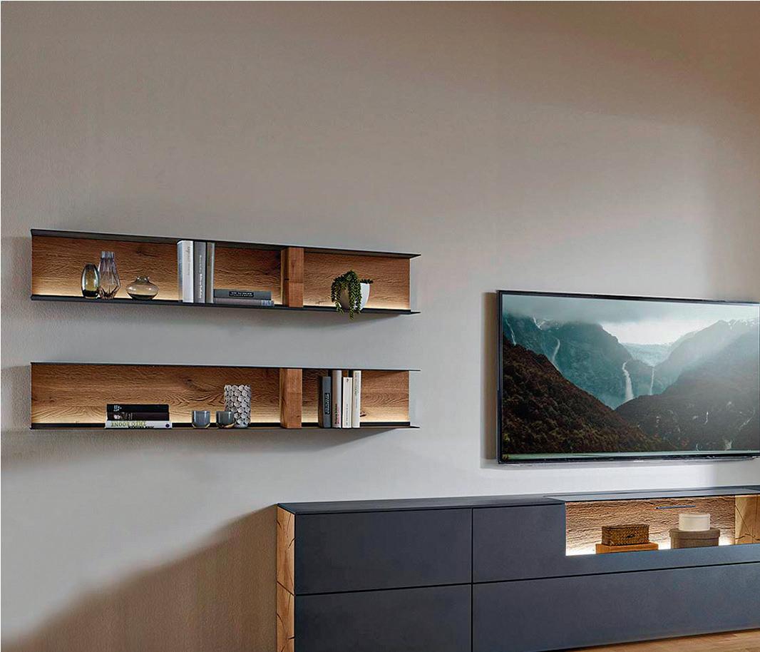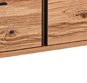 6 Wohnwand «Vangelis» Kerneiche Umato massiv, sägerau gebürstet, Ausführung: Metall anthrazit, bestehend aus Lowboard, B ×T× H: 230 × 60 × 44 cm, 2 Wandpaneelen, B ×T× H: je 128 × 22 × 22 cm, inkl. LED-Beleuchtung. 33540.0.6