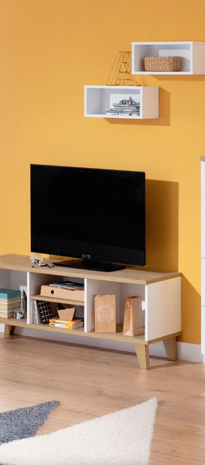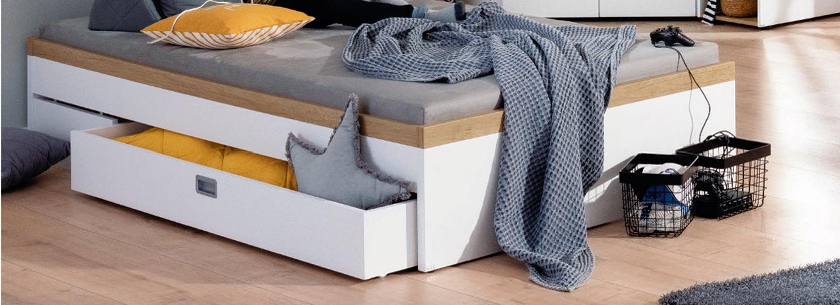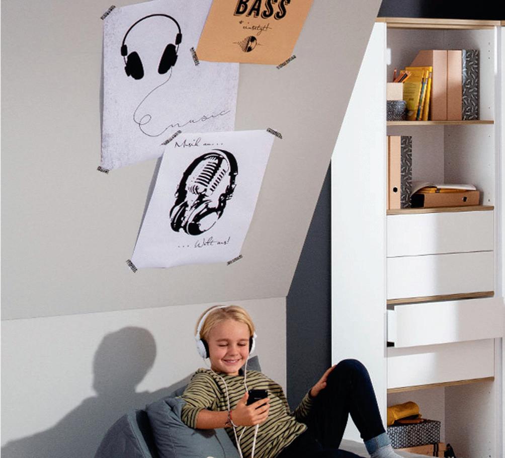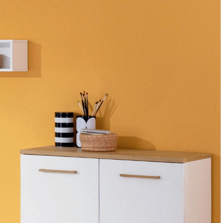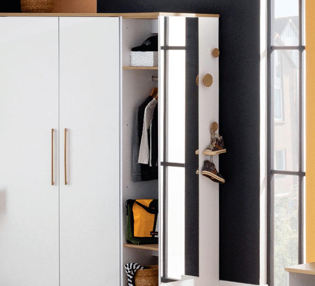 1 Schrank «Olbia» Kreideweiss, Absetzung in Eiche-Dekor Nebraska, verschiedenfarbiges Knopfset, Anstellregal mit Schubkasten, Eckschrank mit Türen, Tablaren & Kleiderstangen, Garderobe mit Tablaren, Kleiderstange, Spiegel & Knöpfen, B ×T× H: 186 × 142 × 206 cm. 25398.0.20. Studioliege «Olbia» Kreideweiss / Eiche-Dekor Nebraska, ¾-Bettkasten, Chill-Kissen, inkl. Einlegerahmen & Matratze, Liegefläche: 120 × 200 cm. 25398.0.23. Lowboard «Olbia» Front & Korpus: Kreideweiss, Deck- & Bodenplatte & Regalböden in Eiche-Dekor Nebraska, 3 Fächer mit Kabeldurchlass, 1 Tablar im mittleren Fach, B ×T× H: 124 × 40 × 50 cm. 25398.0.2.