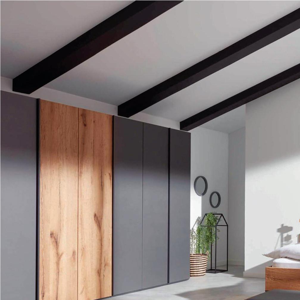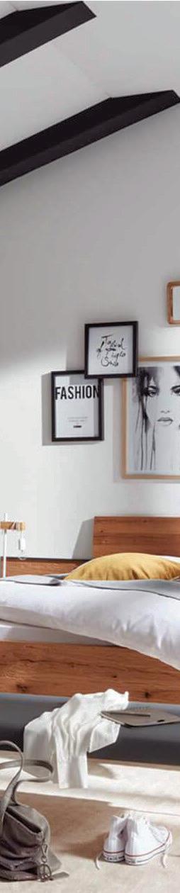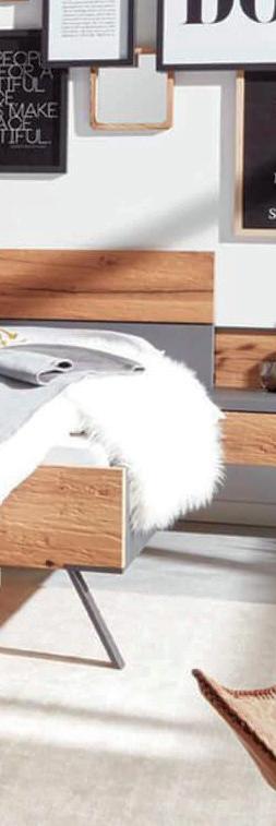 1 Bett «Aachen» Bettseiten & Unterseite Kopfteil Lack graphit, Bett-Frontseite & Oberseite Kopfteil Balkeneiche, Echtholzfurnier, Griffe & Füsse Eisenglimmer, Liegefläche: 180 × 200 cm, exkl. Bettinhalt, B ×T× H: 180 × 219 × 99 cm. 28617.0.10 Drehtürenschrank «Aachen» 5-türig, (2 in Balkeneiche, 3 mit Echtholzfurnier), Korpus & Türen melaminbeschichtete Spanplatte, Lack graphit, Griffe Eisenglimmer, pro Element 2 Tablare & 1 Kleiderstange, B ×T× H: 249 × 62 × 222 cm. Auch 6-türig erhältlich (siehe Abbildung) 28617.1.4.