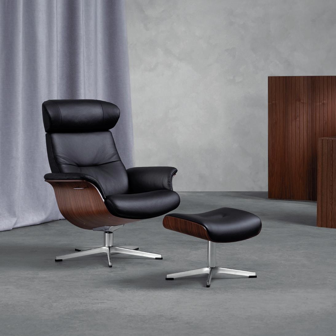8 Relaxer «Time Out» Lederbezug schwarz, Holzschale Nussbaum, Sitzhöhe: 42 cm, Sitztiefe: 51 cm, B ×T× H: 80 × 81 × 101 cm. 17708.6.1. Hocker «Time Out» Lederbezug schwarz, Holzschale Nussbaum, B ×T× H: 51 × 38 × 39 cm. 17708.6.2