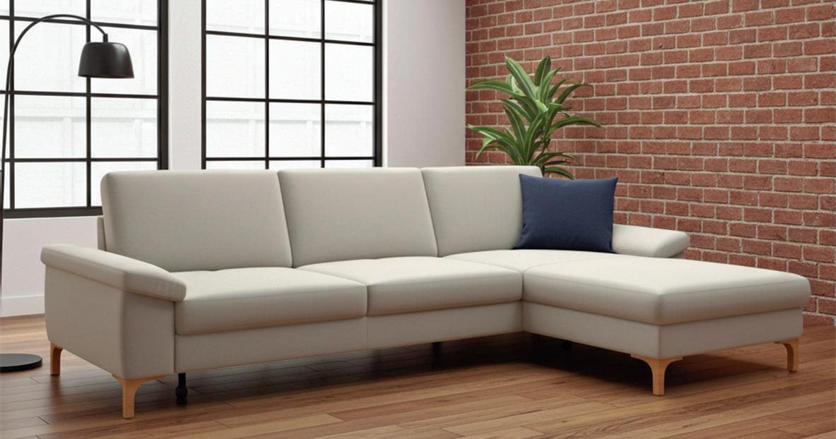 9 Ecksofa «Coventry 2.0» Stoffbezug Nature, verstellbare Sitztiefe, inkl. 1 Kopfteil (nicht abgebildet), manuelle Querschläferfunktion, echt bezogen, Stauraum unter dem Longchair, Eichenholzfuss geölt, B × T: 284 × 185 cm. 18965.62.