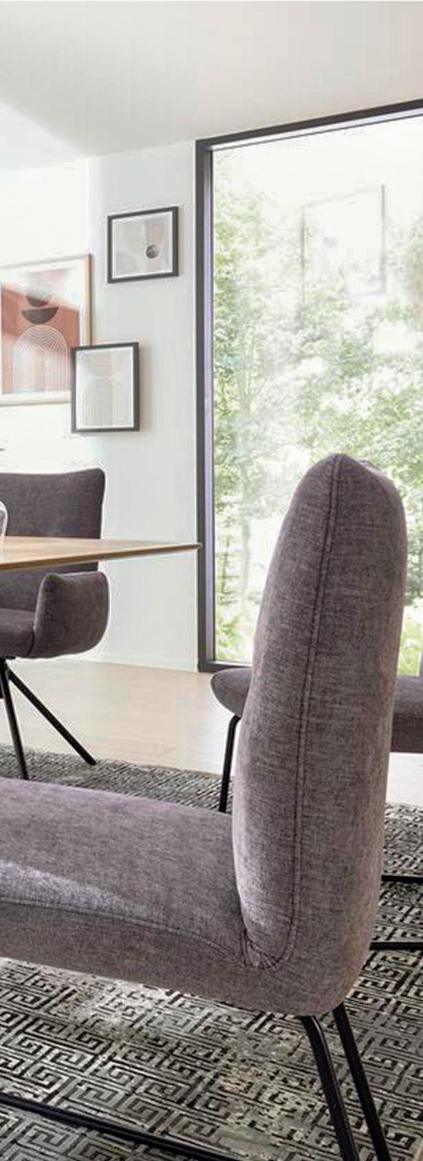 2 Esstisch «Barton» Tischplatte & Steg: Massiv-Eiche, geölt, mit Facetten, Ecken gerundet, Eisengestell & Bodenplatte schwarz, B ×T: 200 × 100 cm. 30287.2. Bank «Jason» Stoffbezug grau, Metalluntergestell schwarz, 2-Sitzer mit 2 Armteilen, Sitzhöhe: 50 cm, Sitztiefe: 46 cm, B ×T× H: 226 × 67 × 89 cm. 30265.0.
