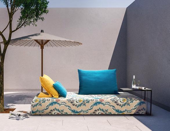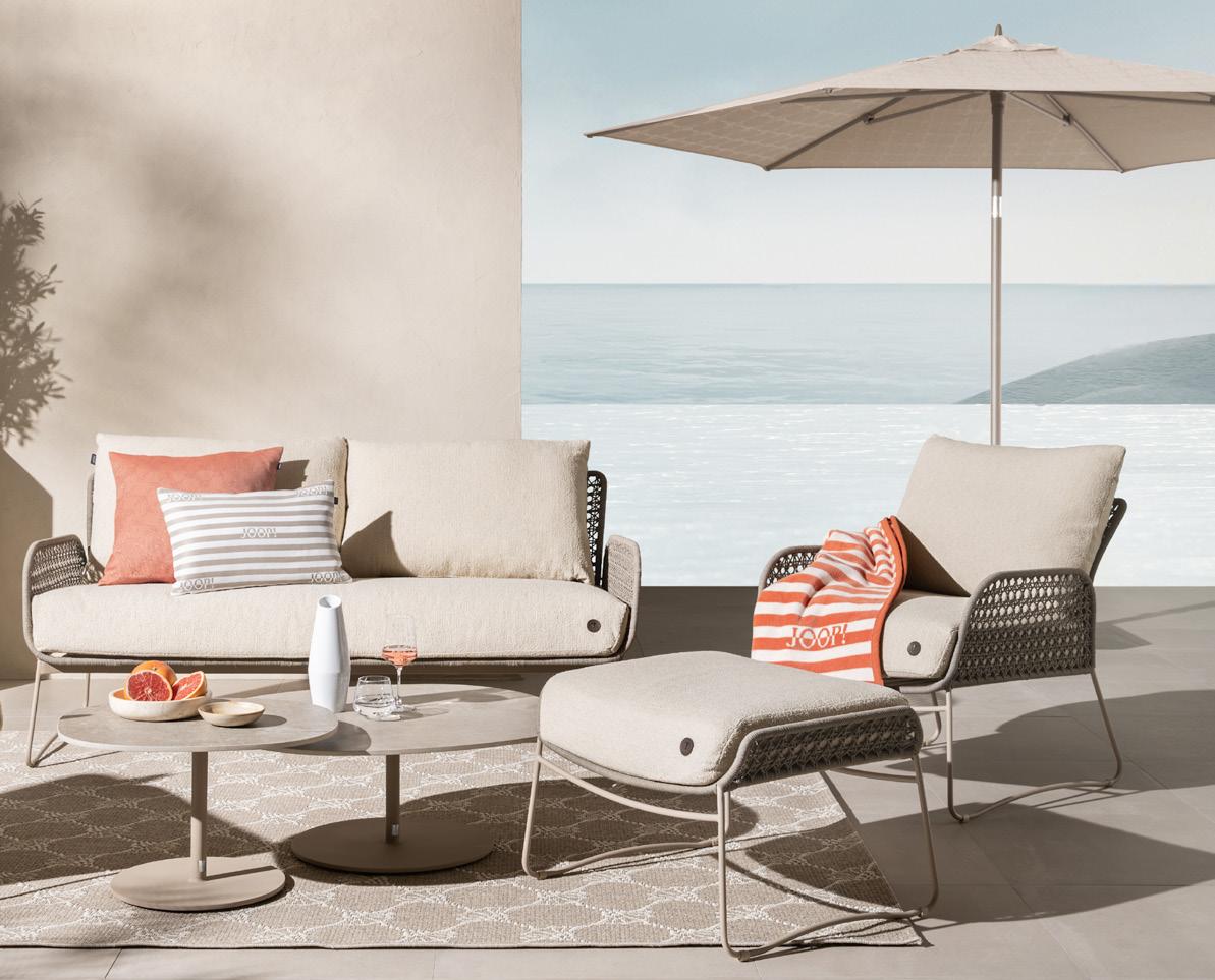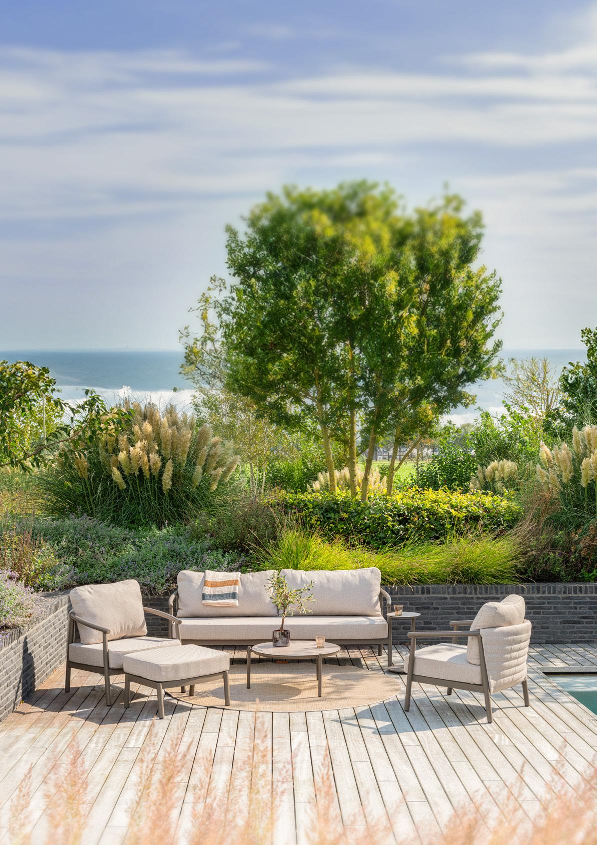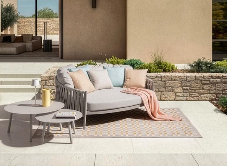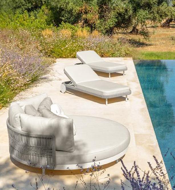 5 Daybed «Jesolo» Olefingewebe: beige abnehmbarer Bezug, Gestell: latte Aluminium pulverbeschichtet, Sitzhöhe: 41 cm, B ×T× H: 160 × 145 × 91 cm. 32934.0.1 Clubtisch «Jesolo» 2erSet, AluminiumTischplatten, pulverbeschichtet, Tisch 1: ø 80 cm, H: 38,5 cm, Tisch 2: ø 60 cm, H: 34 cm. 32934.0.4