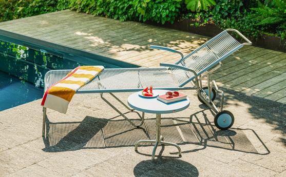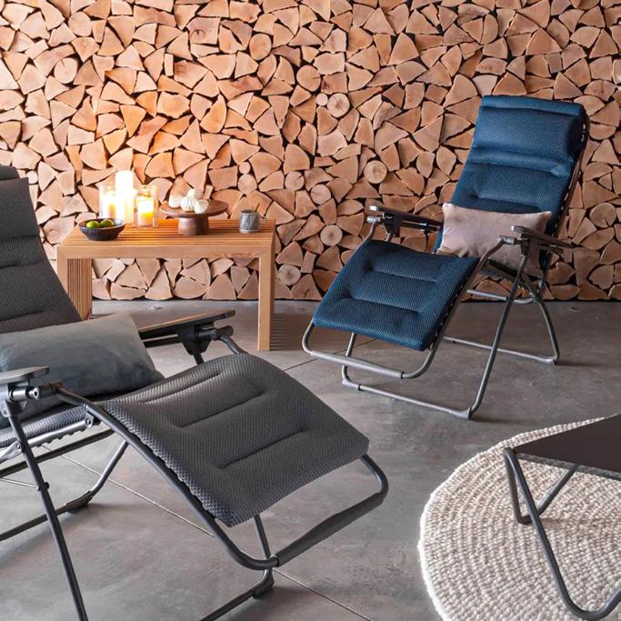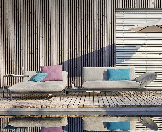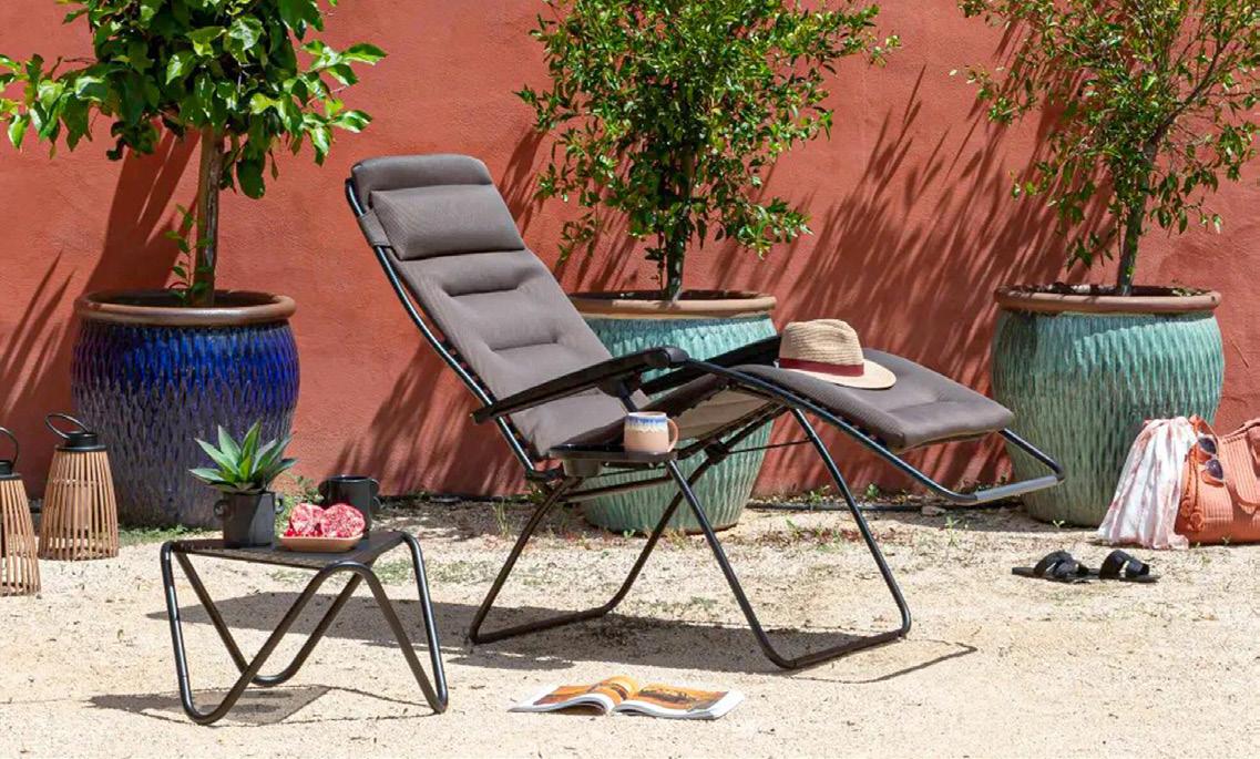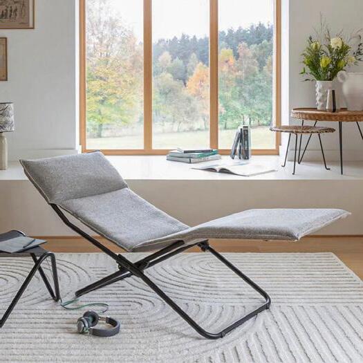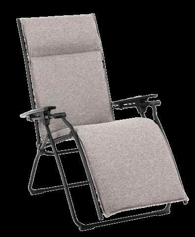 4 Relaxliege «Futura XL» Bezug Batyline ISO, abnehmbar, Stahlrohrrahmen lackiert, stufenlos verstellbar inkl. Feststellbremse, Kopfpolster verstell & abnehmbar, B ×T× H: 76 × 90 – 173 × 95 – 127 cm. 25346.2. Beistelltisch «Vogue» Tischplatte: Stahl verzinkt, lackiert, schwarz, Aluminiumgestell schwarz, B ×T× H: 57 × 57 × 32 cm. 25436.4