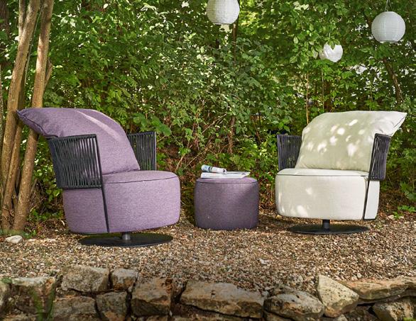5 Gartensessel «Yao» OutdoorStoff, in verschiedenen Farben erhältlich, DrehSchaukelsessel, 360° drehbar mit Metallbodenplatte, Feinstruktur schwarz, B ×T× H: 85 × 74 × 91 cm. 31502.0.6 Gartenhocker «Yao» OutdoorStoff, in verschiedenen Farben erhältlich, passend zum Sessel Yao. D × H: 47 × 44 cm. 31502.0.7