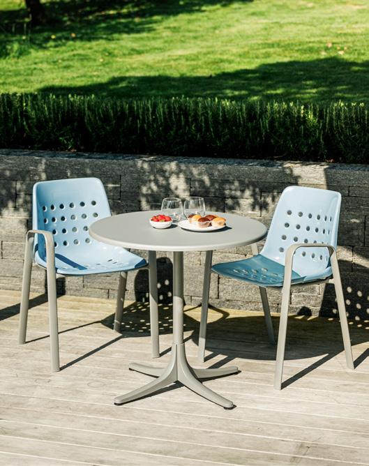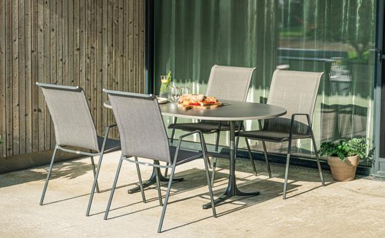 3 Gartentisch «Schaffhausen» Fiberglasplatte mit 25 % Glasfasern, Stahlrohrsäule verzinkt mit Polyesterbeschichtung, Füsse aus Aluminiumdruckguss mit Bodenausgleich, abklappbar, demontierbar, wetterfest, ø 75 cm. 9902.36. Gartenstuhl «Bermuda» Sitzfläche: Fiberglasplatte 8 mm mit 25 % Glasfasern, Stahlrohrgestell mit Polyesterbeschichtung, wetterfest, B ×T× H: 160 × 32 × 46 cm. 16669.159.