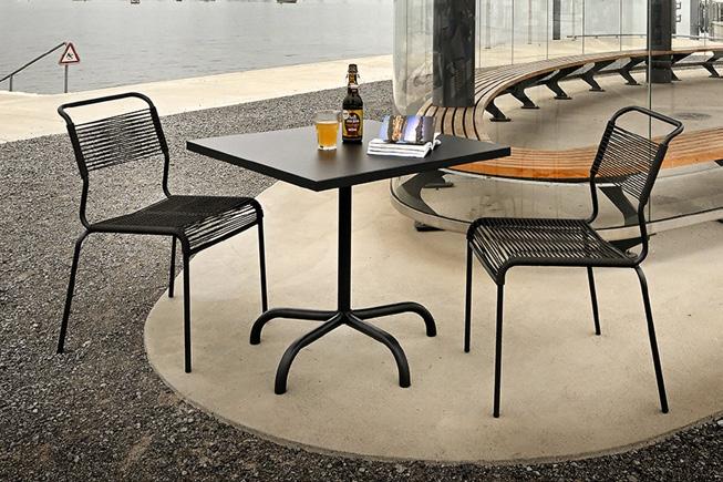 1 Metalltisch «Säntis» Tischblatt: verzinktes Stahlblech mit Polyesterpulvereschichtung, Gestell galavanisch verzinkt & beschichtet, demontierbar, wetterfest, 2teilig, B ×T× H: 80 × 80 × 72 cm. 33333.131. Spaghetti-Stuhl «Säntis» Sitzfläche: Spaghettibezug OceanYarn, Stahlrohrgestell anthrazit mit Polyesterpulverbeschichtung, Sitzhöhe: 46 cm, B ×T× H: 44 × 61 × 85 cm. 33334.708.