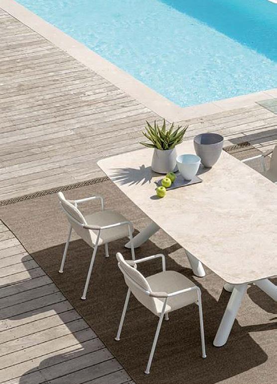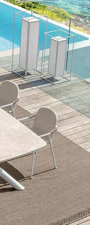 2 Gartentisch «Coral» KeramikTischplatte beige, AluminiumTischgestell weiss, B ×T× H: 238 × 118 × 75 cm. 31491.2. Gartenstuhl «Coral» Stoffbezug beige, Aluminiumgestell: weiss, Sitzhöhe: 63 cm, B ×T× H: 60 × 65 × 83 cm. 31491.3. Gartenlampe «Cleo» Aluminiumgestell: Inox white, B ×T× H: 35 × 35 × 66 cm. Auch in 90 cmHöhe erhältlich. 31484.6.