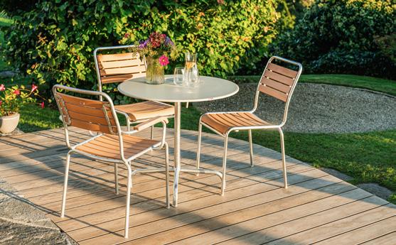 4 Metall-Tisch «Rigi» Tischblatt: verzinktes Stahlblech mit Polyesterpulverbeschichtung, 4FussGestell feuerverzinkt, demontierbar, wetterfest, ø 80 cm. 5827.494. Holzlatten-Stuhl «Rigi» Sitzfläche: Latten aus Schweizer Eiche natur, Stahlrohrgestell, feuerverzinkt, Sitzhöhe: 47 cm, stapelbar, wetterfest, B ×T× H: 50 × 61 × 86 cm. 5827.565. Holzlatten-Stuhl «Rigi mit Armlehnen» B ×T× H: 59 × 61 × 86 cm. 5827.222.