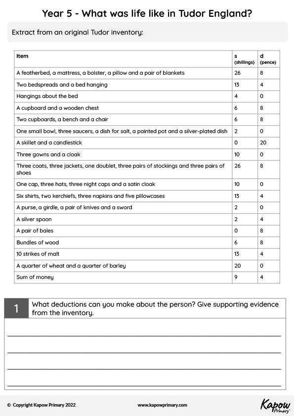 Comparing Henry VIII and Elizabeth I, children learn about the changing nature of monarchy. They learn how both monarchs tried to control the public perception of themselves using portraits and royal progresses. Using Tudor inventories to investigate whether people were rich or poor, children learn about what life was like for people living in Tudor times.