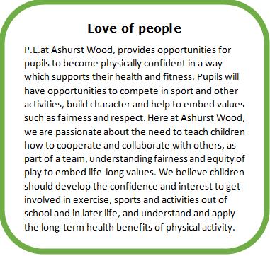 At Ashurst Wood we use the Twinkle PE materials which are organised in a two year rolling programme. Lessons cover;