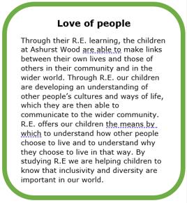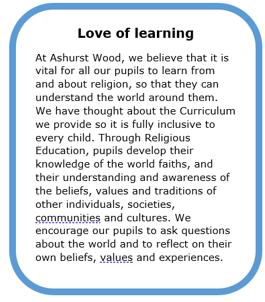 At Ashurst Wood we use KPOW to support our teaching of Religious Education. RE is not Nationally determined but locally determined using the Local Agreed Syllabus. Our curriculum is aligned with the local syllabus and reflects the principal religions in Great Britain. Exploring concepts through an enquiry-based approach our children will investigate a variety of world religions, including but not limited to: