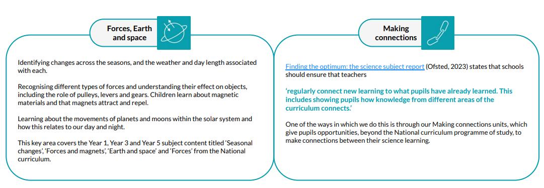 The 'Working Scientifically' element of the science curriculum is ongoing throughout KS1 and KS2. It is embedded within the content of biology, chemistry and physics, focusing on the key features of scientific enquiry, so that pupils learn to use a variety of approaches to answer relevant scientific questions.
