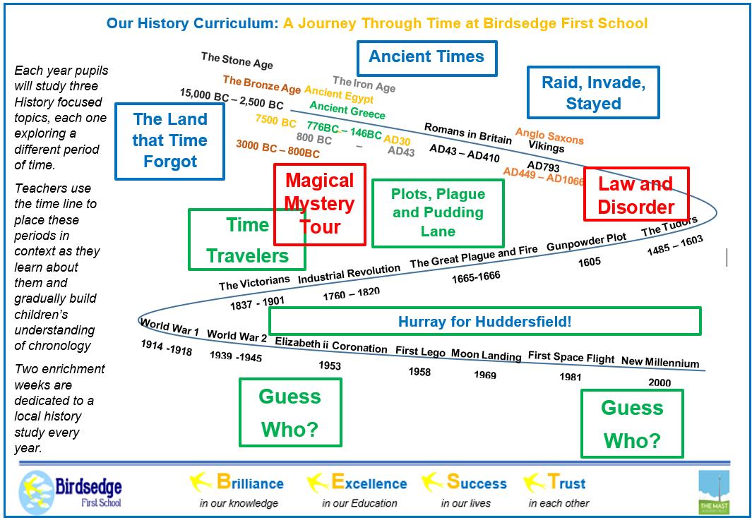 Curriculum: At Birdsedge First School our History teaching aims to deliver a curriculum which enables the children to become confident, creative, independent and individual learners, providing them with an understanding of the past through learning about human achievements and experiences. The children will develop their sense of chronology throughout the study of the topics in Key Stage 1 and 2.