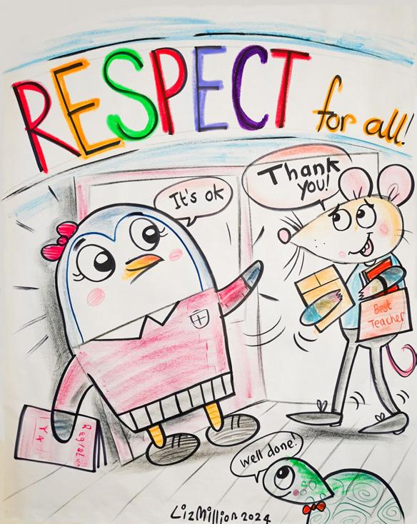 Throughout the day, different year groups had their own session with illustrator, Liz Million. In these sessions we practiced drawing with her. All of our drawings were about British values and Catholic Social Teaching: Democracy, Freedom, Law, Individual Liberty and Respect. While we were drawing, we had lots of laughs and learnt about her career. As she drew, we drew along with her and by the end we had produced lots of outstanding drawings. The part we all loved the most was when she bonked us on our heads with a big inflatable Crayon!