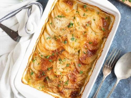 5. Pour over the stock (Do not over fill as it will overflow) and bake for 25-30 mins until the potatoes are cooked and the top is golden and crisp.