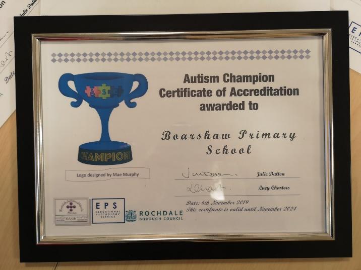 An accreditation review took place on 20th June 2019 and where we successfully met the threshold in 4 key areas, those being leadership, support for individual pupils, environment and resources, partnership and liaison with parents/carers. Our staff have worked really hard to undertake training and attend cluster meetings to help ensure we were meeting the threshold required. The details of the excellent feedback we received can be found on our school website.