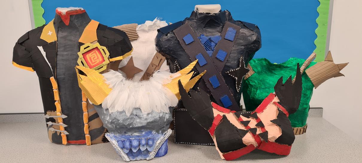 Our fantastic Year 9 art students have been exploring the design process and a variety of making methods to inform construction. The students have been exploring materials and techniques that are paper based, pressings, tonal drawings, biro drawings, dry brushing, drawing from observation, paper engineering, papier mùché. As well as looking at the work of H.R. Giger. They have been very busy creating a final piece, which is a Science Fiction inspired armor piece.