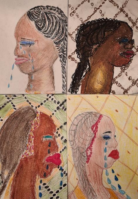 This term, our lovely Year 8s have been studying the artwork titled, 'No woman, no cry,' by Chris Ofili. They have been developing an understanding of the context of the artwork. As well as developing their observational drawing skills, oil pastel application skills and mono printing skills