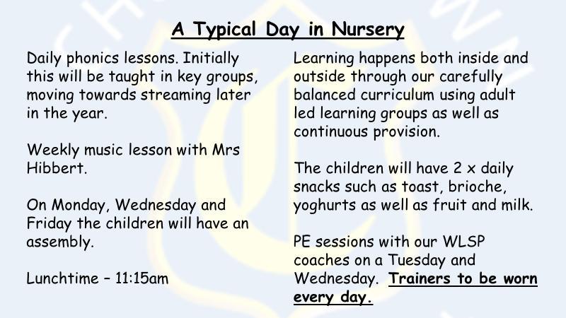 Daily phonics lesson – in reception these are streamed by ability. In nursery this will be taught in key groups.