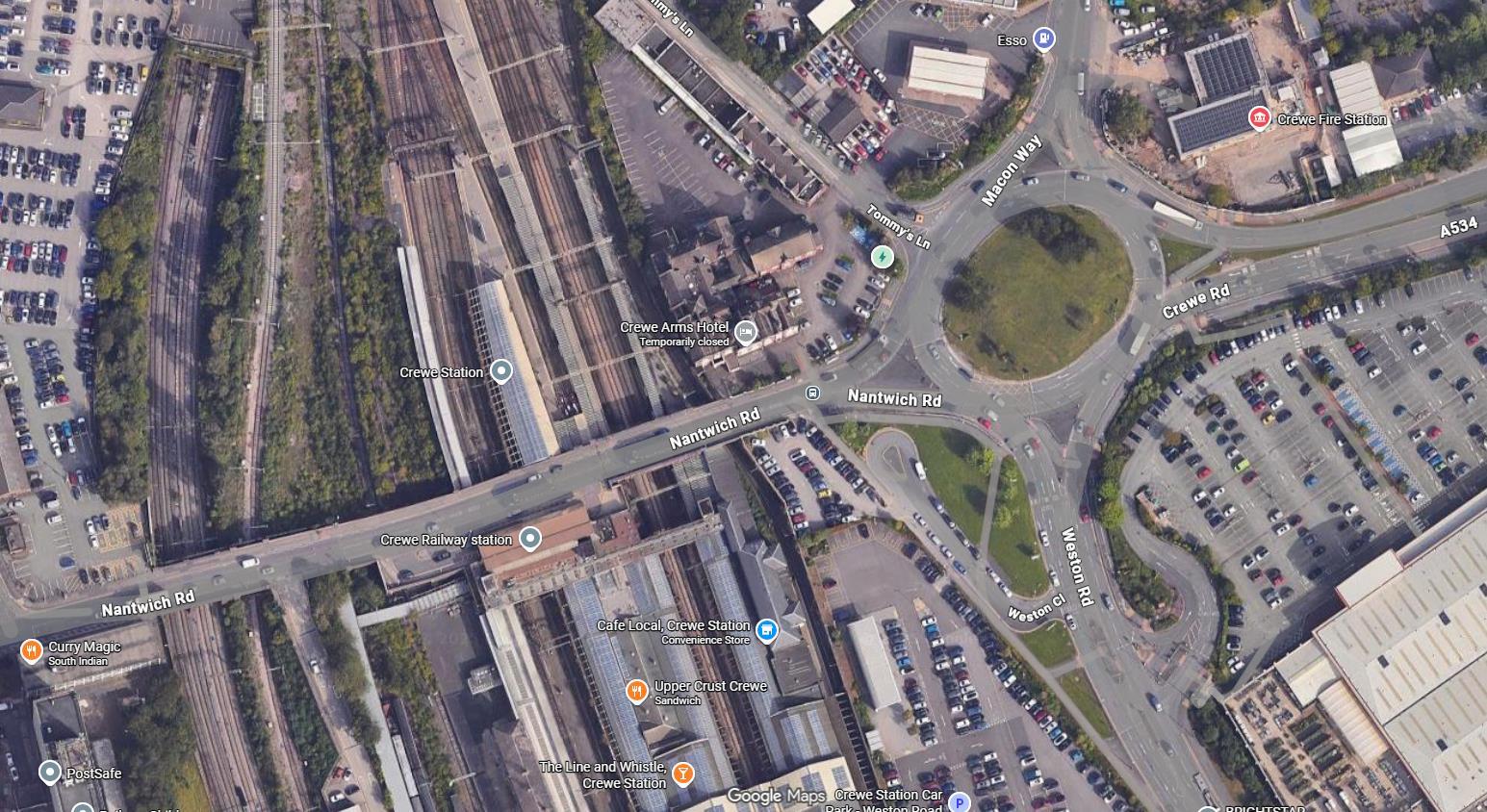 • This is the principal route into Crewe from the M6. The Crewe Arms roundabout to the east of the station is always congested.