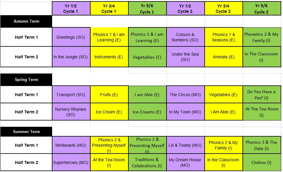 Dedicated French lessons are taught weekly to all year groups using Language Angels. Themes are aligned and built on level by level through each year group. We also use songs, continuous provision and every day opportunities to apply and reinforce the learning and vocabulary acquired through our French lessons.