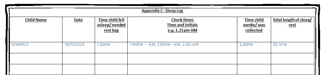The Early Years will ensure that anyone who supports a child sleeping or resting in nursery or Reception is an employee of the nursery or school and has had appropriate safeguarding checks and is aware of procedures and responsibilities for supporting childrenās sleep.