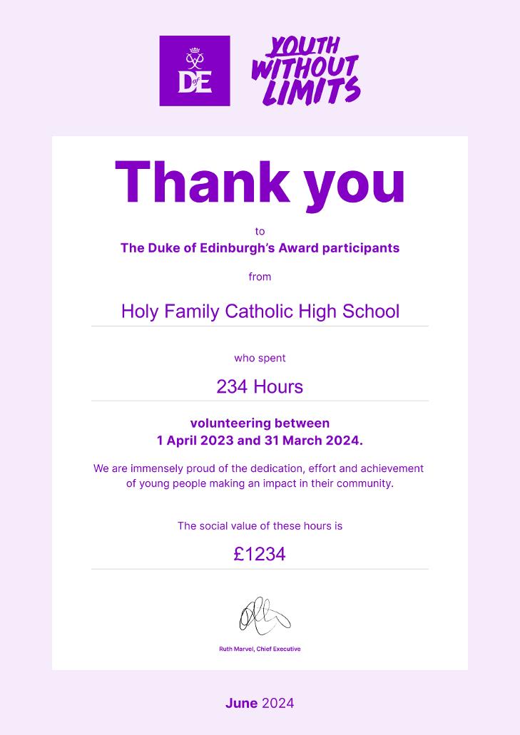 Bronze and Silver Awards for the Duke of Edinburgh Awards Scheme have hit record numbers in Holy Family High School. There have been 110 Bronze awards and 42 silver awards earned by Holy Family pupils this academic year. Each of the candidates participated in a voluntary activity, physical recreation and they learnt a skill. For the voluntary activity the school was awarded a social value certificate which showed the pupils of Holy Family High School contributed 234 hours of their own time to do volunteering and help charities and vulnerable people within society. This is aside from the two expeditions that each group had to undertake whilst completing the award. These are achievements which are recognised by employees and universities alike.
