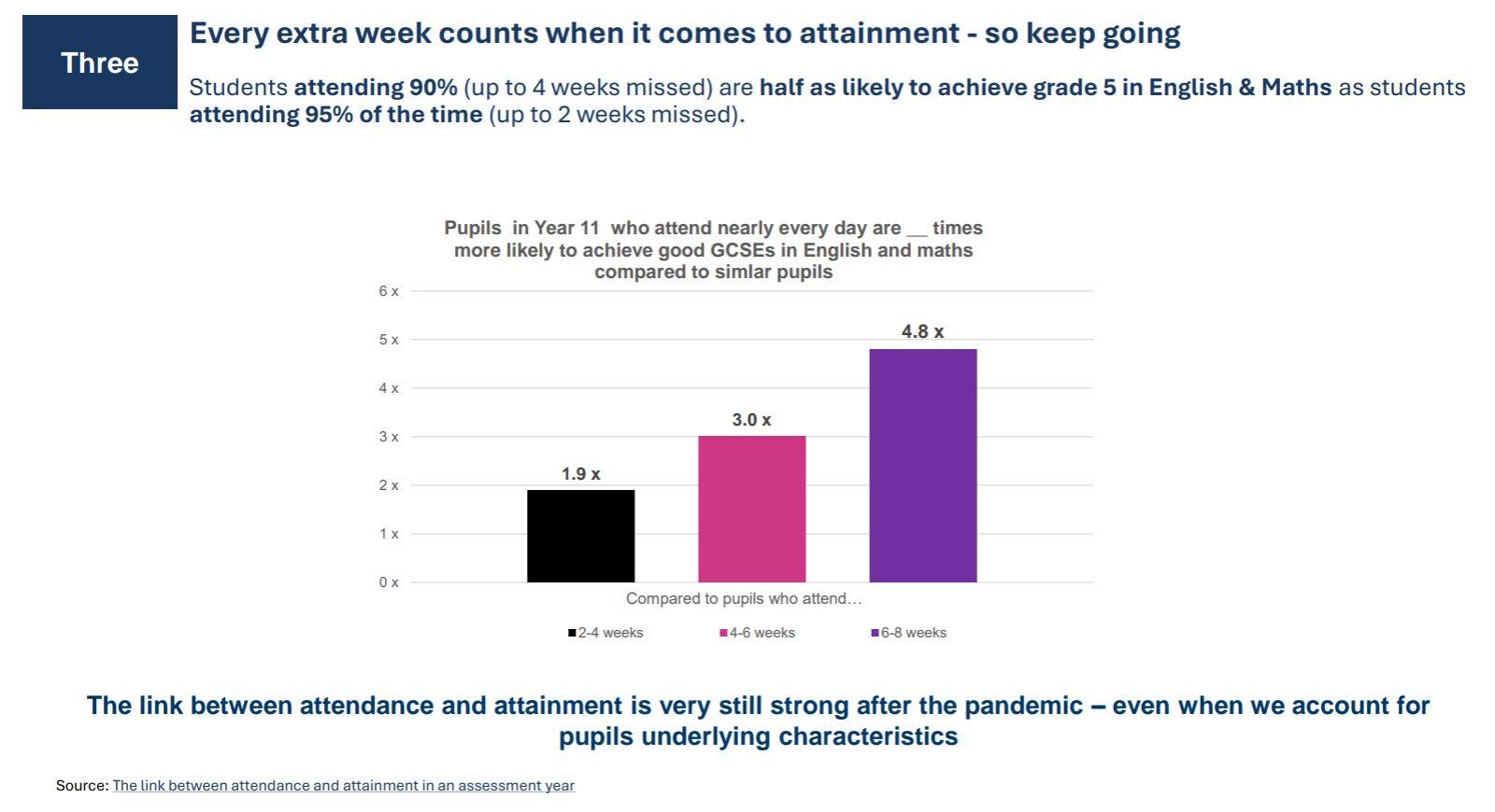 Students who are classed as Persistently Absent (less than 90% attendance) are half as likely to achieve a grade 5 in their English and Maths GCSE’s compared to a student attending school for 95% plus. If a student is classed as Persistently Absent that is the equivalent of missing 4 weeks/1 month of school during the academic year. In terms of lessons and lost learning this equates to 100+ hours of lost learning.