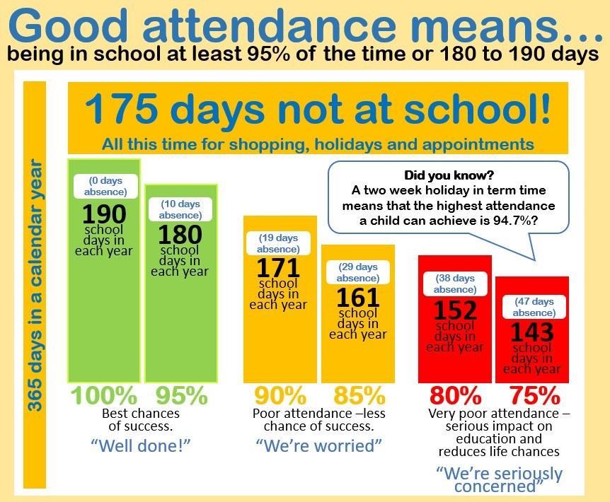 Coming to school is important - good attendance gives YOUR child the very best chance of success. It has a positive impact on your child’s learning and well-being, and is directly linked to raising achievement and developing skills for life and work. Please support your child by ensuring that they attend school every day and arrive ready to learn, on time at 8.50 am.