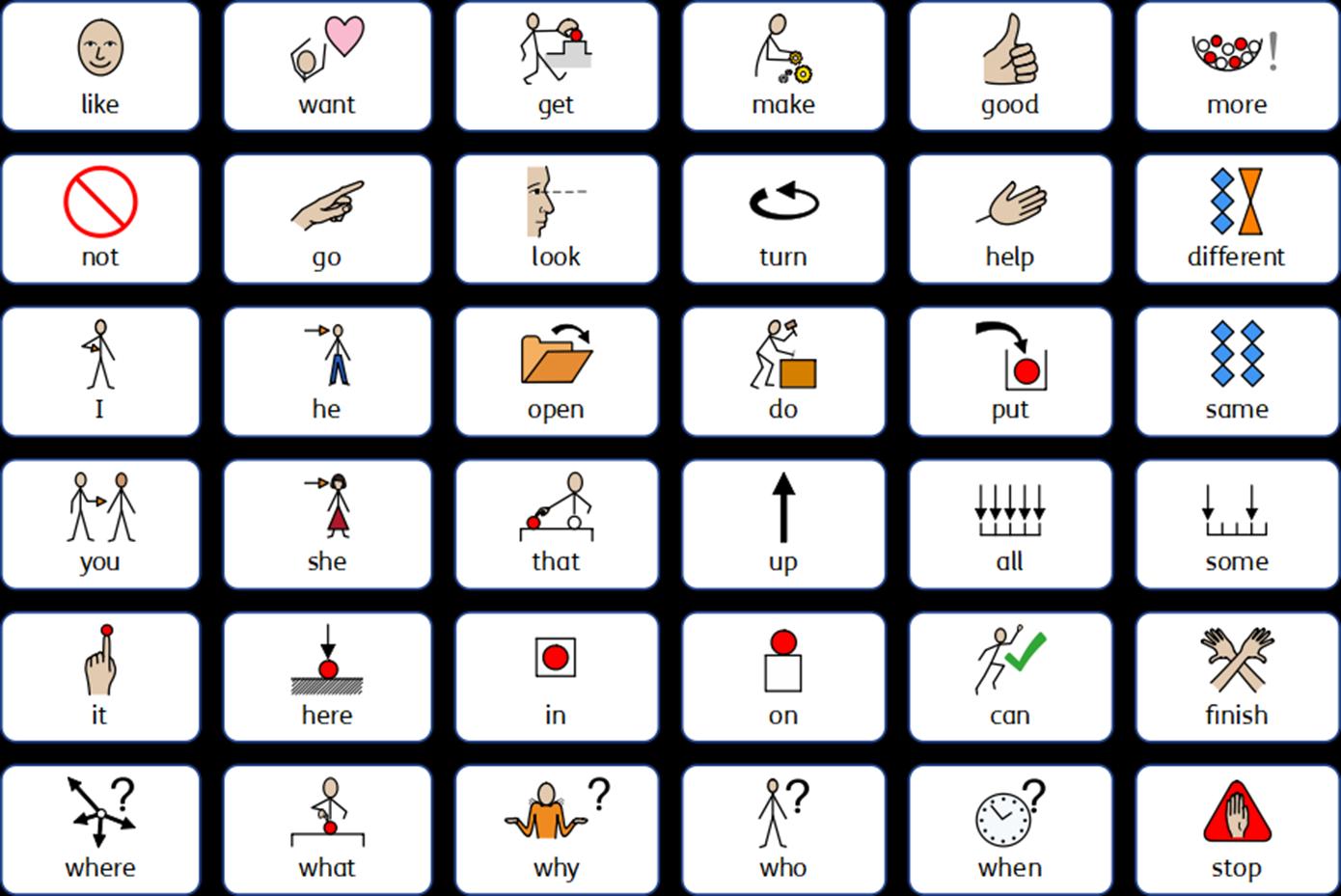 The Universal Core vocabulary is a set of 36 highly useful single words that can be used alone or in combination to communicate for a range of purposes on countless topics. The Universal Core vocabulary is available through low tech and high tech AAC devices. It is available in a range of differentiated versions that are available on the school system for staff to personalise and embed in lessons. The Universal Core vocabulary and implementation model is aimed at students with significant disabilities who do not yet use speech, signs or symbols to communicate in flexible ways.