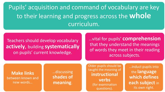 Extend pupils’ vocabulary by explicitly teaching new words, providing repeated exposure to new words, and providing opportunities for pupils to use new words.
