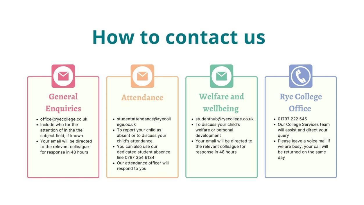 The College believes open and regular communication with families is crucial to our success. If you have a question or concern and need to talk to a colleague, please refer to our staff list. In order to reach one of our colleagues, please eMail the office – office@ryecollege.co.uk in the first instance.