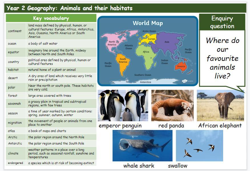 • This unit gives a geographical context to children’s interests in, and prior knowledge of, animals through a study of five continents. It looks at pandas, penguins, sharks and elephants, as well as lesser-known birds, such as the swallow. The unit also focuses the children on specific landscapes, people and issues associated with real places. It starts by showing what these animals’ homes are like and addressing misconceptions they might have. It offers a chance to introduce North and South America, which is studied in the KS2 Geography Programme of Study.