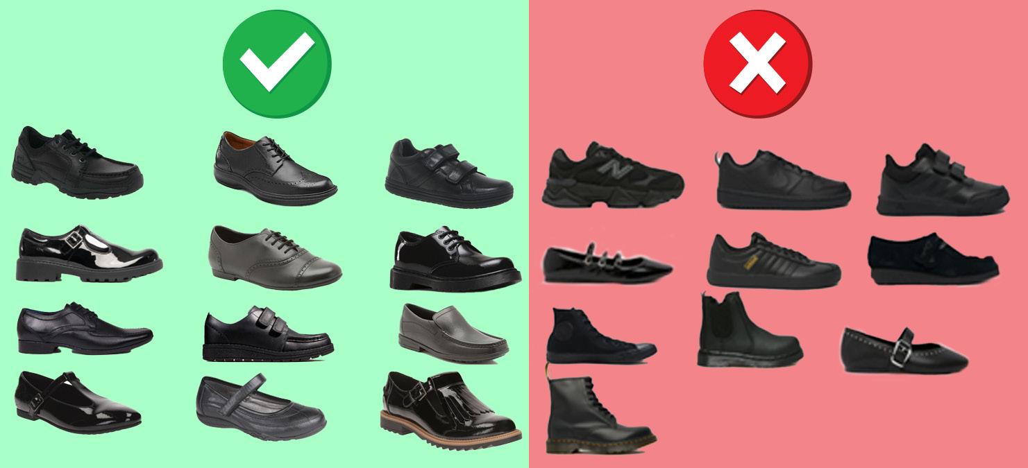 Footwear This MUST be a plain black shoe without logos – high/wedge heels, boots, sandals, pumps, training/sports shoes, sports branded footwear (such as ‘Nike’) will NOT be allowed. In snow, pupils may wear wellington boots/boots whilst travelling to and from school but will be expected to bring school shoes to change into once in school.