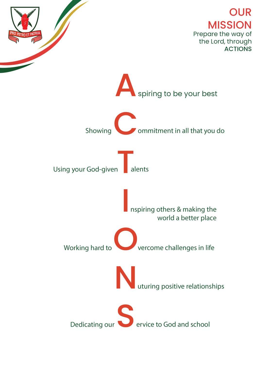 Every day, we strive to live out the values of the Gospel which are embodied in our school Mission Statement in its commitment to “Prepare the way of the Lord”, through our, ACTIONS, as these are the foundation of our relationships with each other and the wider world.