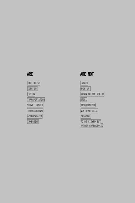 Transportation, Extraction, Assembly, Sculpture, Consumerism, Materiality, Found Objects, Iconography, Displacement, Influences, Rebellion, Mixed Media, Sound Scape, Environment, Context, Re-Contextualize, Curation, Immersive, Subliminal, Message, Emotion, Confusion, Rhetoric, Territory, Appropriation, Surveillance, Promotional, Transaction, Conspiracy, Transformation, Platform, Identity, Economy, Knockoff, Forage, Diaspora, Parallax, Ambiguous, Kitsch